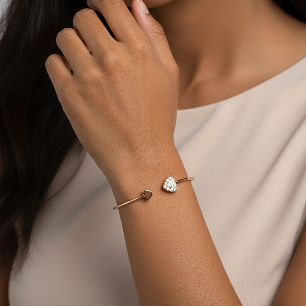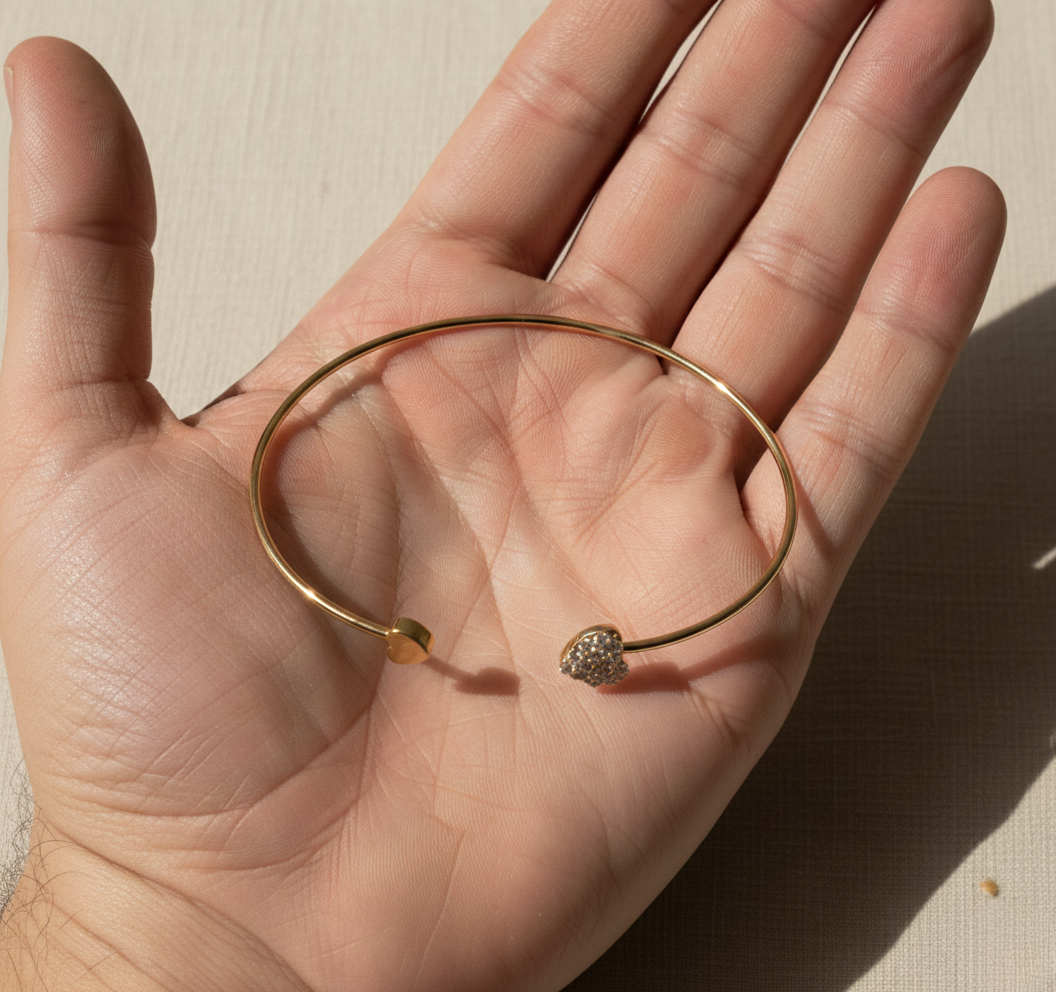 Verleihen Sie Ihrem Handgelenk einen Hauch von Romantik mit unserem offenen Herz-Armreif in strahlender Goldfarbe. Das minimalistische Design besticht durch ein elegantes Doppel-Herz-Motiv: Während ein Herz in schlichter Eleganz glänzt, funkelt das gegenüberliegende Herz mit hochwertigem Strass-Besatz. Ein zeitloses Schmuckstück, das Liebe und Stil perfekt vereint.