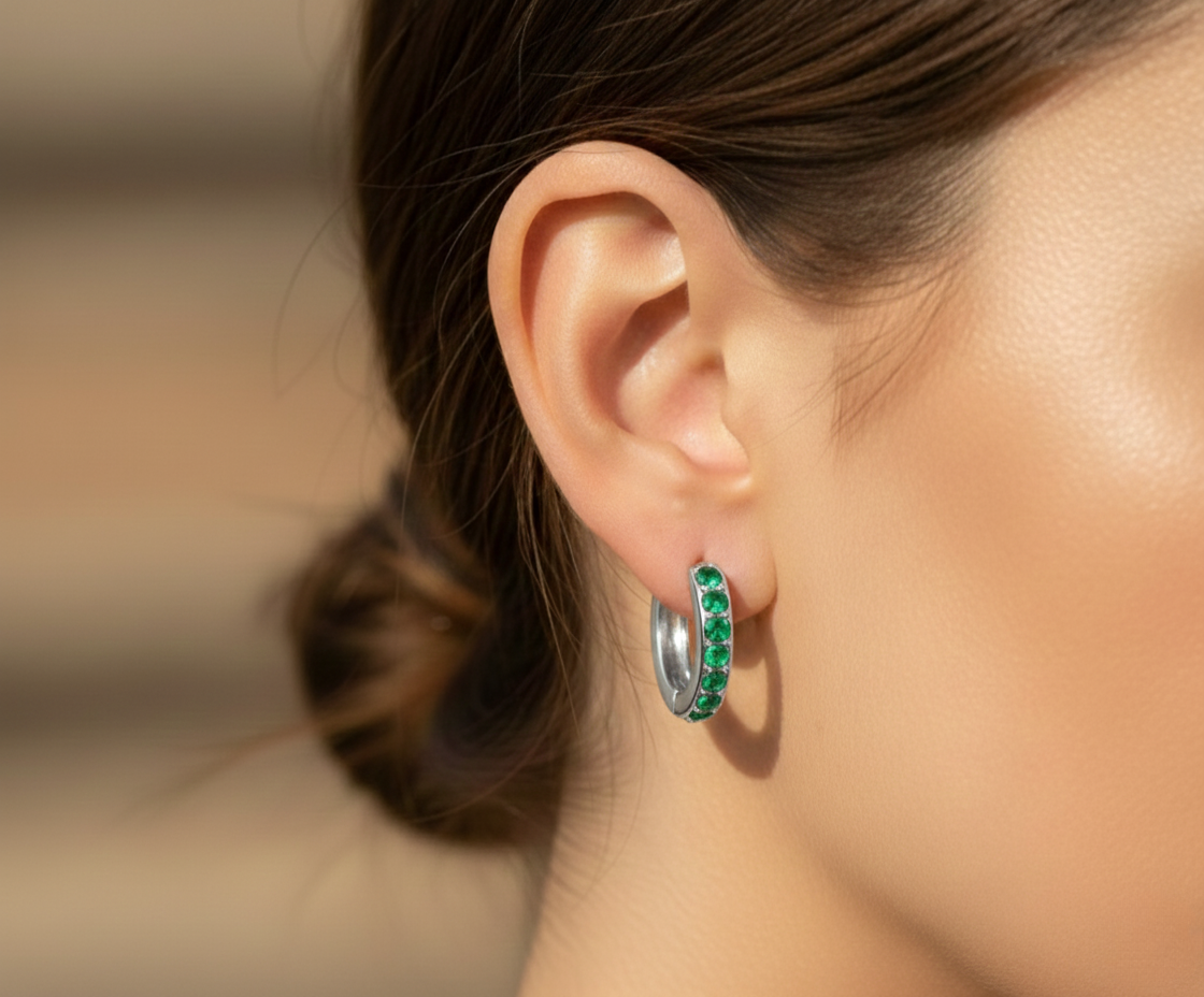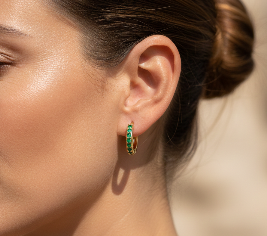 Setzen Sie ein Statement mit zeitloser Eleganz: Diese kompakten Huggie Creolen in Goldfarbe bestechen durch ihren intensiven Besatz mit grünen Zirkonia Steinen, die an edle Smaragde erinnern. Das feine Pavé-Design sorgt für ein luxuriöses Funkeln und macht diese Ohrringe zum perfekten Accessoire für anspruchsvolle Styles.