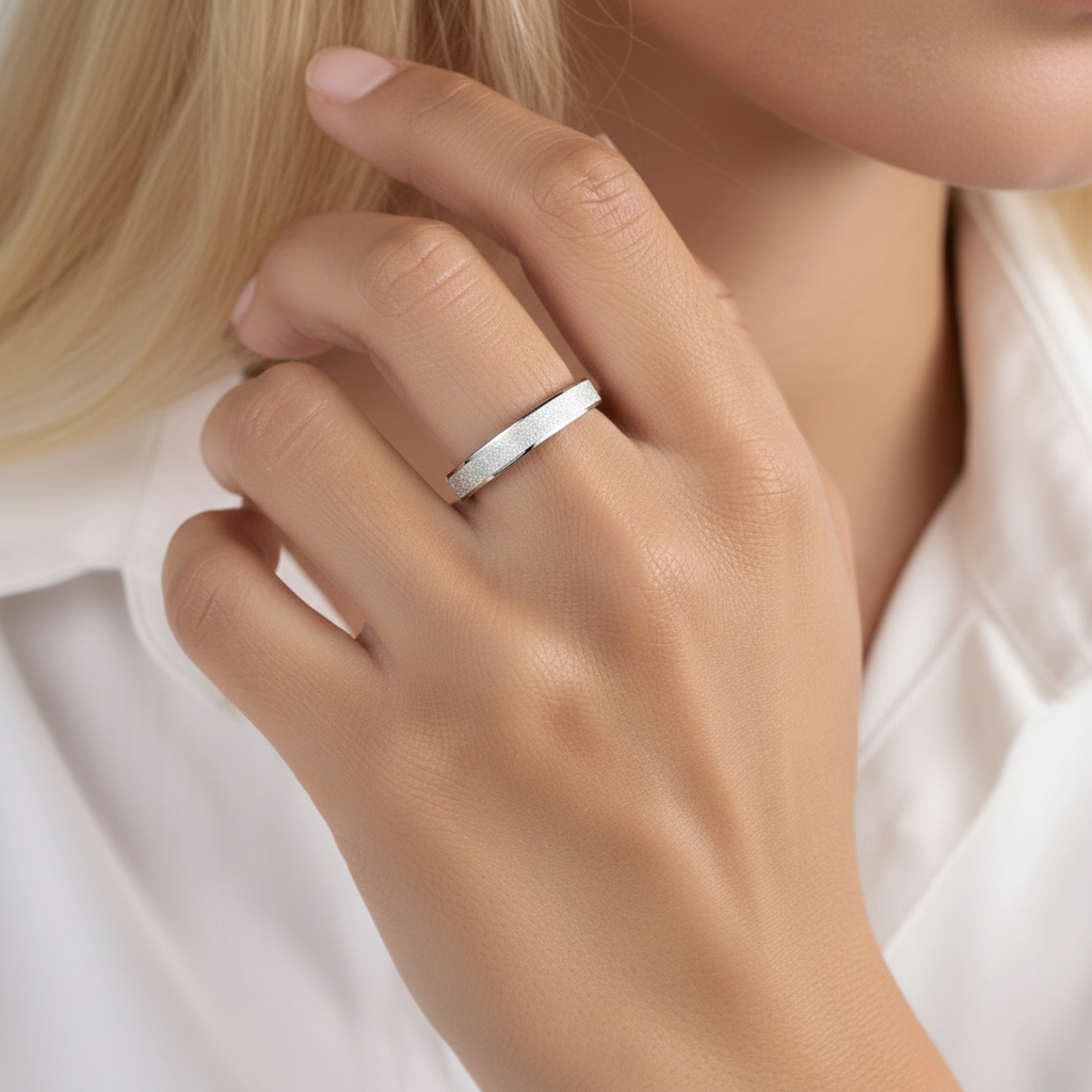 Erleben Sie minimalistische Eleganz mit einem funkelnden Twist: Dieser 4mm breite Bandring besticht durch seine außergewöhnliche Frosted-Oberfläche in zeitloser Silberfarbe. Das sandmatte Finish reflektiert das Licht bei jeder Bewegung dezent und macht diesen Ring zum idealen Begleiter für moderne Stacking-Looks oder als ausdrucksstarkes Einzelstück.