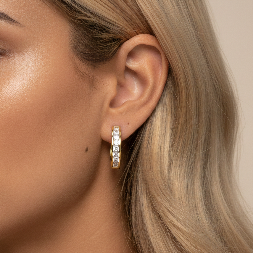 Verleihen Sie Ihrem Look ein exquisites Funkeln mit diesen eleganten Huggie-Creolen im zeitlosen Eternity-Design. Die lückenlos aneinandergereihten, quadratisch geschliffenen Zirkonia-Steine im edlen Kanal-Setting sorgen für Brillanz aus jedem Winkel. Ein luxuriöses Statement für das erste oder zweite Ohrloch, das klassischen Stil mit moderner Präzision vereint.