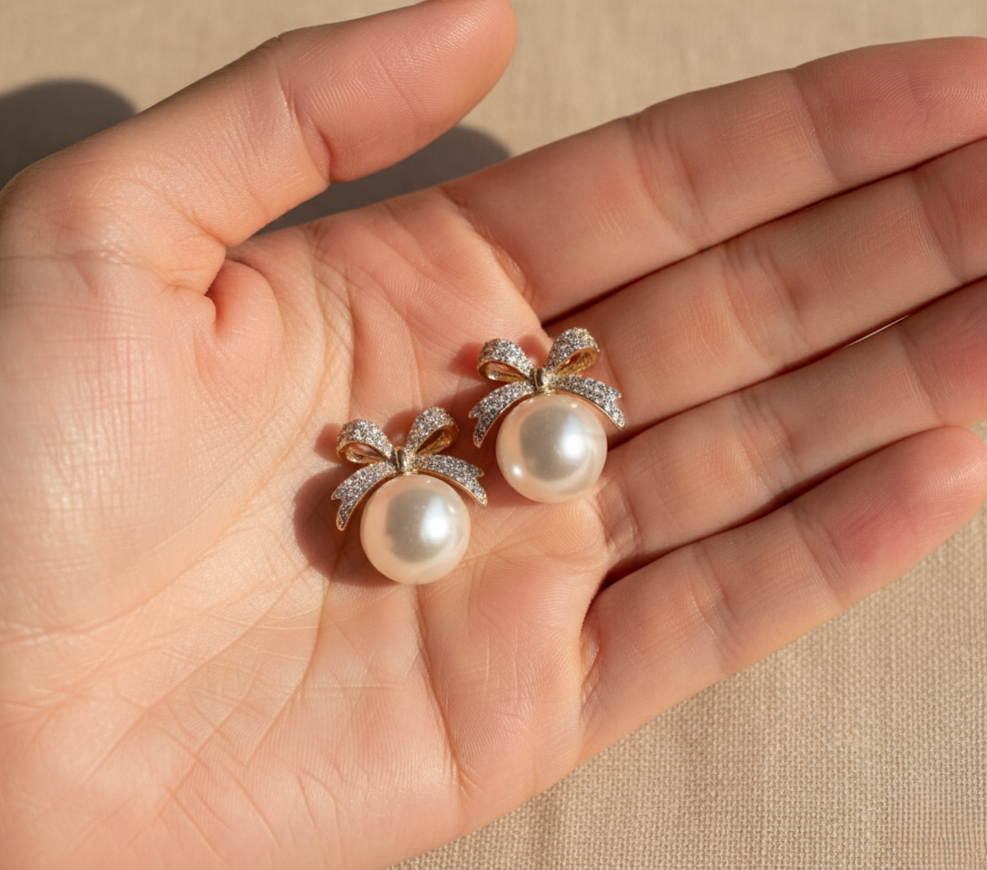 Elena | Romantische Perlenohrringe Goldfarben Schleife Damen Ohrstecker Strass
