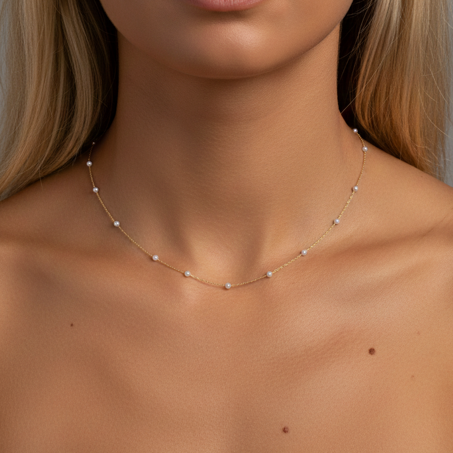 Veredeln Sie Ihren Alltags-Look mit dieser zarten Halskette in edler Goldfarbe. Die filigrane Gliederkette ist mit feinen Imitationsperlen im Station-Design besetzt und verkörpert zeitlose Eleganz für das Dekolleté – ein Must-have für minimalistische Layering-Styles oder als dezentes Einzelstück.